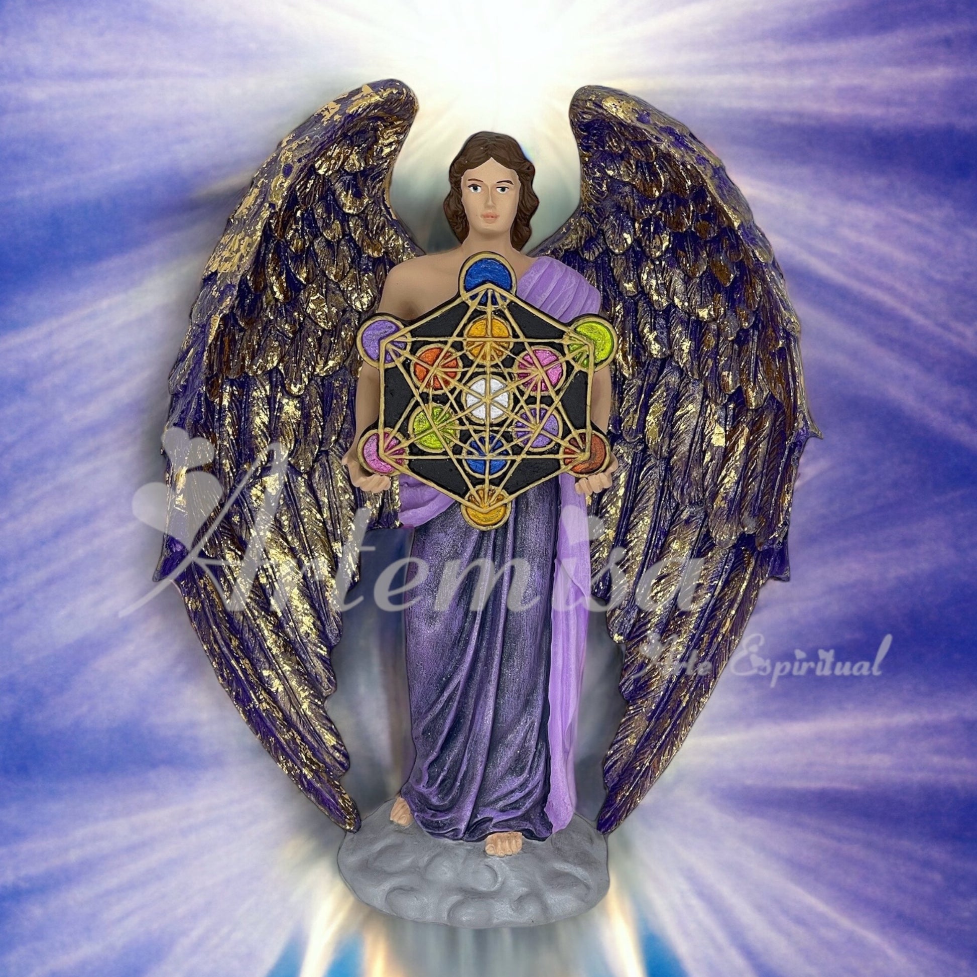 La figura de Metatrón, meticulosamente esculpida y detallada, lo que la convierte en una obra central en tu colección de objetos espirituales. Metatrón es el arcángel que guía a las almas hacia la sabiduría y la transformación, y su Cubo de Escudo representa la protección y el equilibrio divinos.